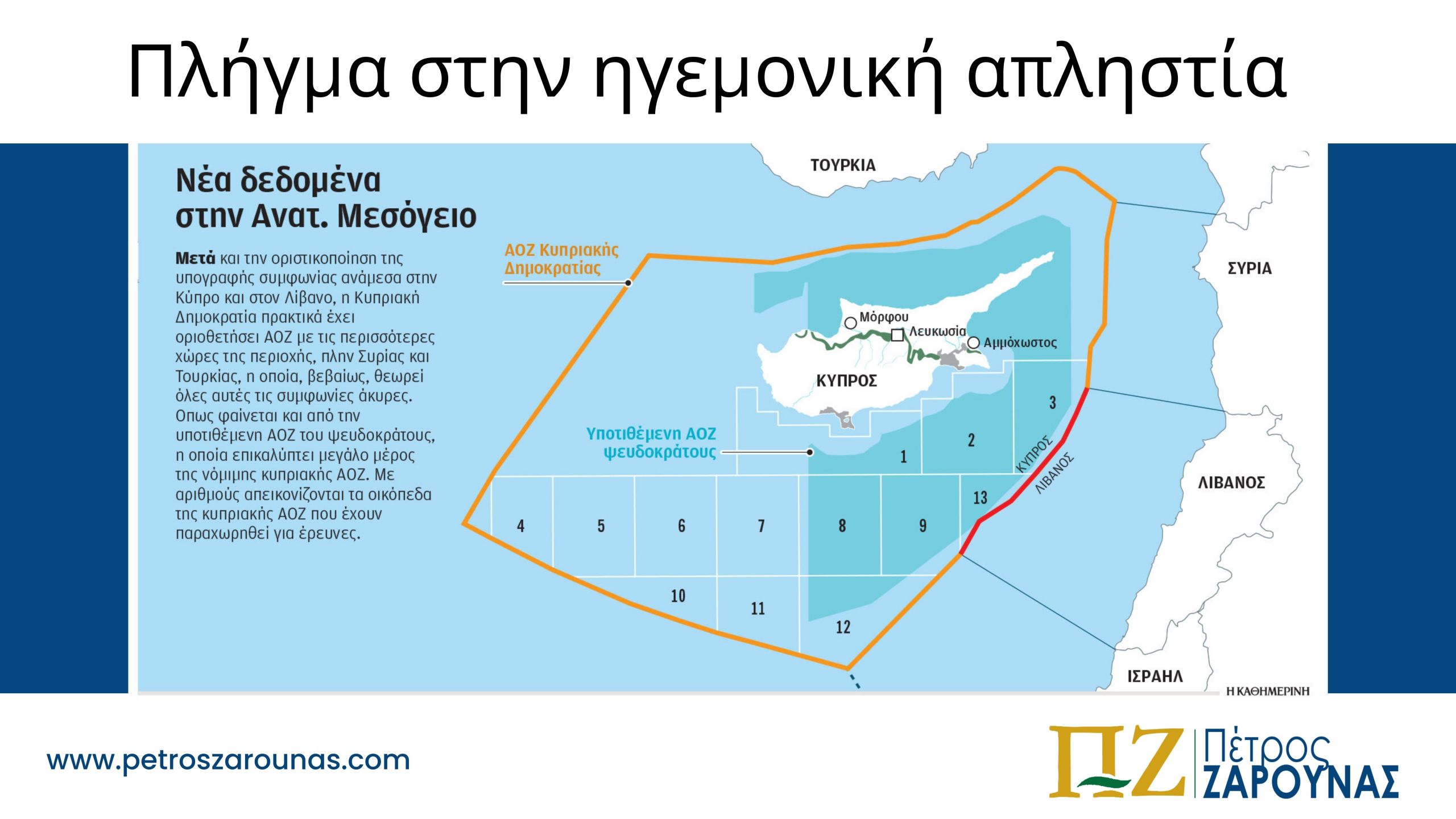 Με επιδέξιο τρόπο η ΚΔ κατάφερε αξιοποιώντας την προηγηθείσα οριοθέτηση Λιβάνου-Ισραήλ, την αποδυνάμωση της Χεζμπολά και το ευρωπαικό της χαρτί να πείσει τον πρόεδρο Αούν να συναινέσει σε μία νέα συμφωνία οριοθέτησης. Συγχαρητήρια αξίζουν τόσο στον πρόεδρο Νίκο Χριστοδουλίδη όσο και στον επικεφαλής της κυπριακής διαπραγματευτικής ομάδας πρέσβη και σύμβουλο εθνικής ασφαλείας Τάσο Τζιονή.